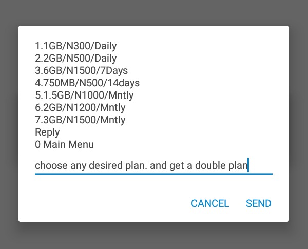 4. 750mb/₦500 (2)weeks and get 750mb extra ➡️ 1.5gb. 5. 1.5gb/₦1000 monthly and get 1.5gb extra➡️ 3gb.